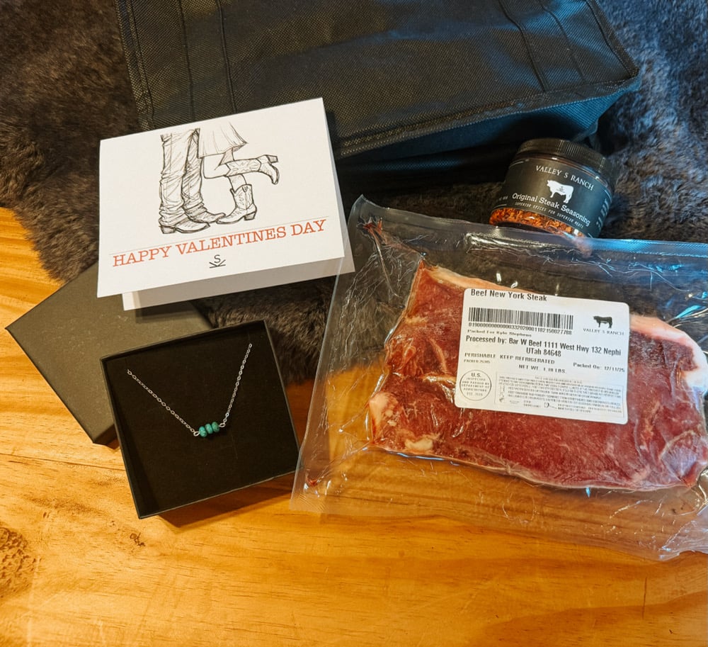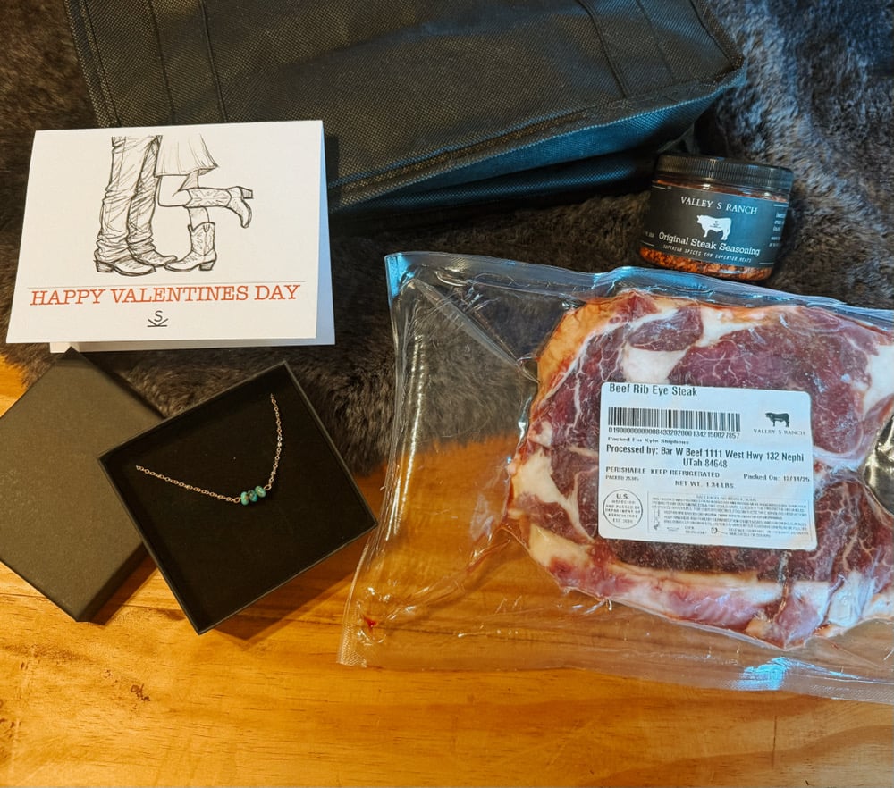 Valentine’s Day is handled with a set of two steaks (Choose Ribeyes or NY strip) for dinner and gold plated OR sterling silver and genuine turquoise rhondell necklace. Complete with a Valentine’s Day card, our signature seasoning all in a reusable refrigerated bag.